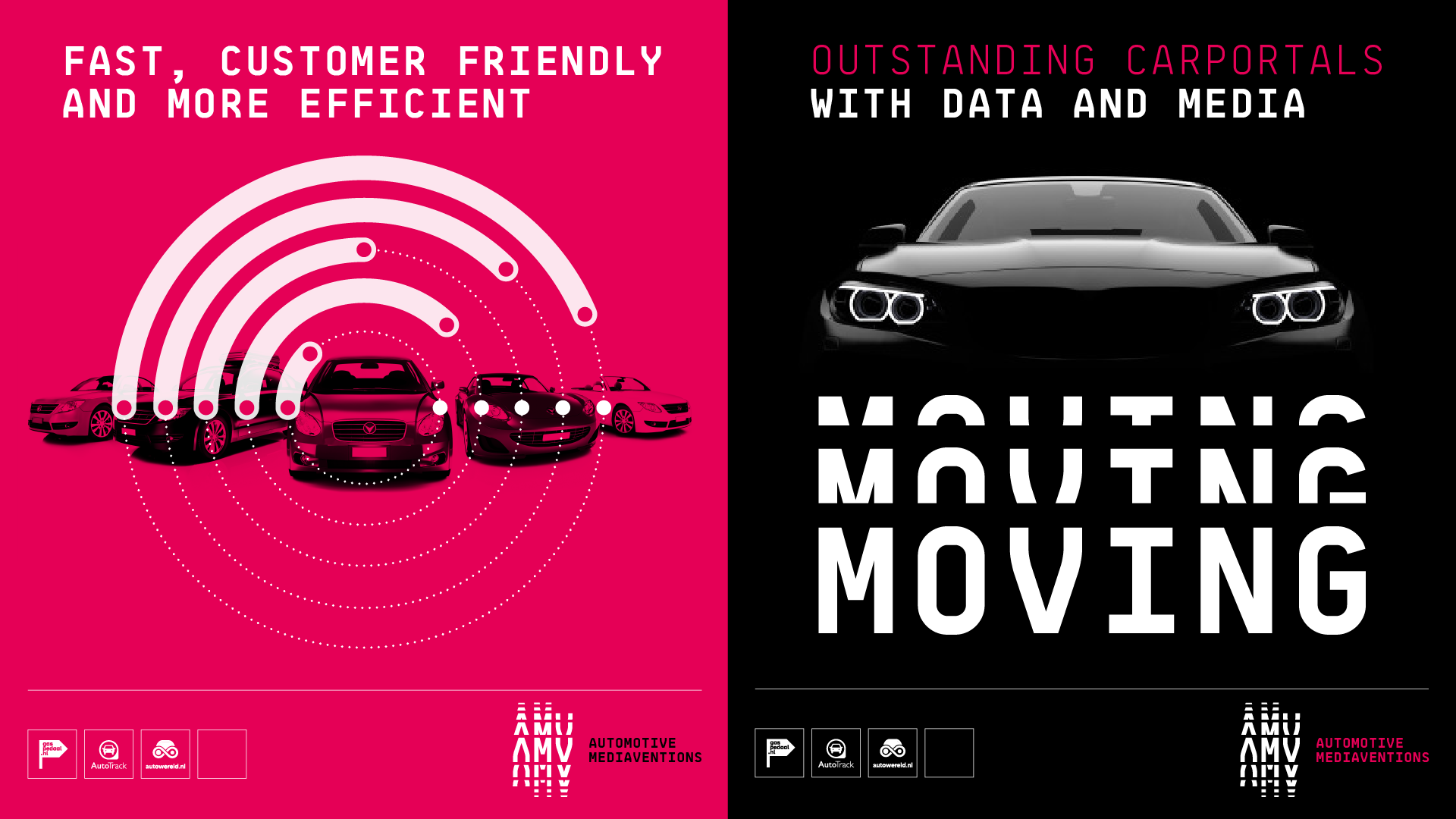 Automotive MediaVentions (AMV) is een nieuwe, unieke samenwerking tussen DPG Media en Mediahuis, de twee grootste Nederlandse mediabedrijven. AMV stelt autobedrijven in staat om Nederlandse autokopers sneller en efficiënter te bereiken. Door de sterke consumentenmerken Gaspedaal.nl, AutoTrack en Autowereld.nl te combineren met de beschikbare data van de twee grootste mediahuizen van Nederland, weet AMV hoe het juiste aanbod aan de juiste koper op de juiste plaats en tijd gedaan kan worden. AMV is een dynamisch merk dat de business voor haar klanten in de Nederlandse auto-industrie vooruithelpt.