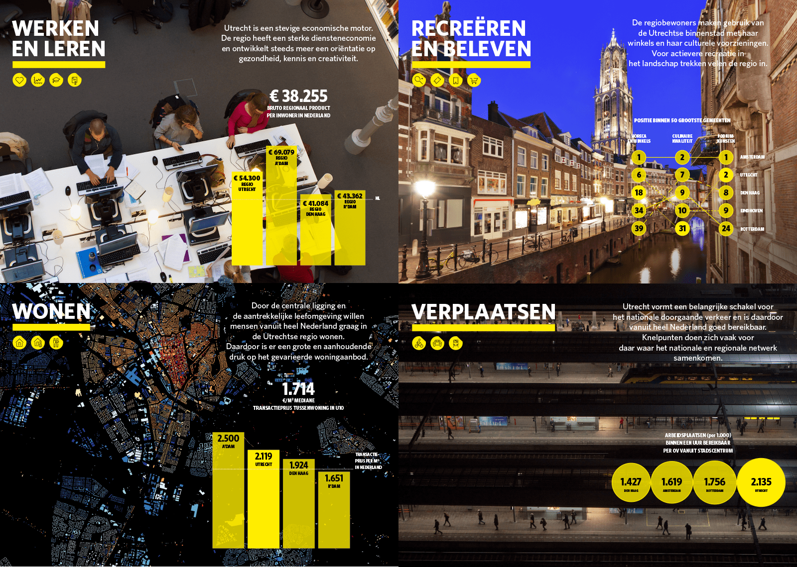 De bruisende dorpen en steden Utrecht, Woerden, Stichtse Vecht, De Bilt, Zeist, Houten, Nieuwegein, Vianen en IJsselstein zijn onderdeel van de regio Utrecht en sterk met elkaar verbonden. Als infrastructureel knooppunt passeren miljoenen mensen de regio op weg naar hun bestemming met de auto of het openbaar vervoer. Maar wat is de regio Utrecht precies? Is er sprake van één regio, en wat zijn daarvan de kenmerken? Hoe wonen en werken mensen en waar recreëren ze in de regio?