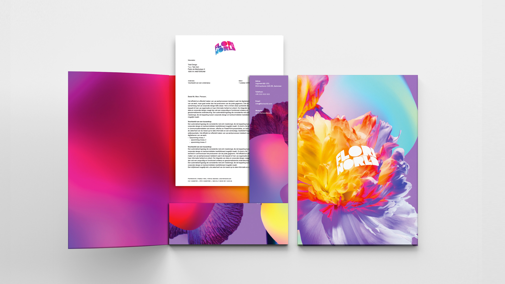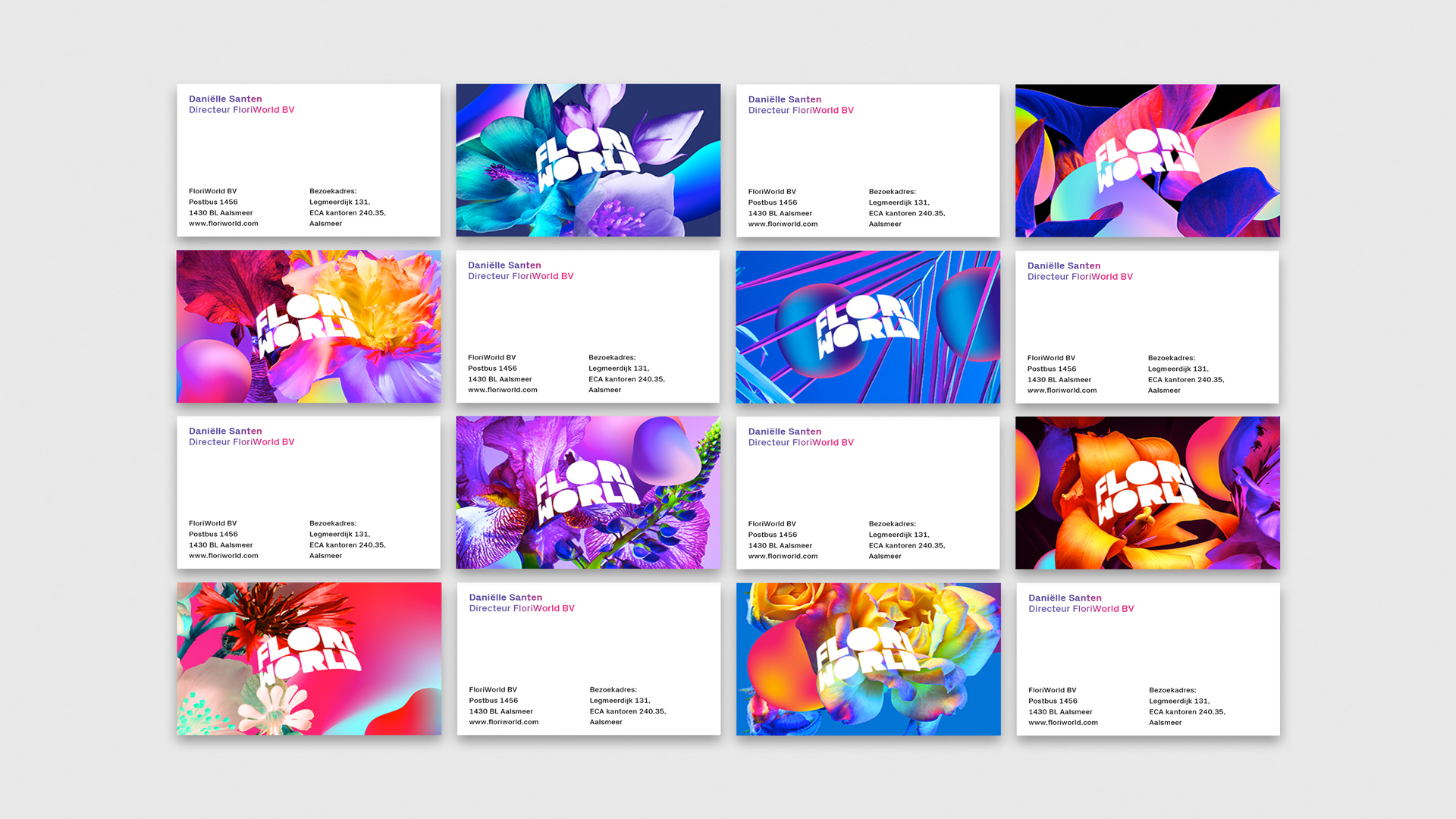 Om bezoekers aan te trekken is gekozen om een visuele identiteit te creëren die de samensmelting tussen kunst, gezondheid en natuur vangt. De wereld van het surrealisme en moeder natuur diende als inspiratie. De visuele identiteit bestaat uit een logo, wegbewijzering, website, illustraties, fotografie stijl, de fysieke ruimtes van Floriworld en merchandise. Net als bloemen en planten zal het concept blijven groeien en ontwikkelen in nauwe symbiose met de Floriworld-ervaring.