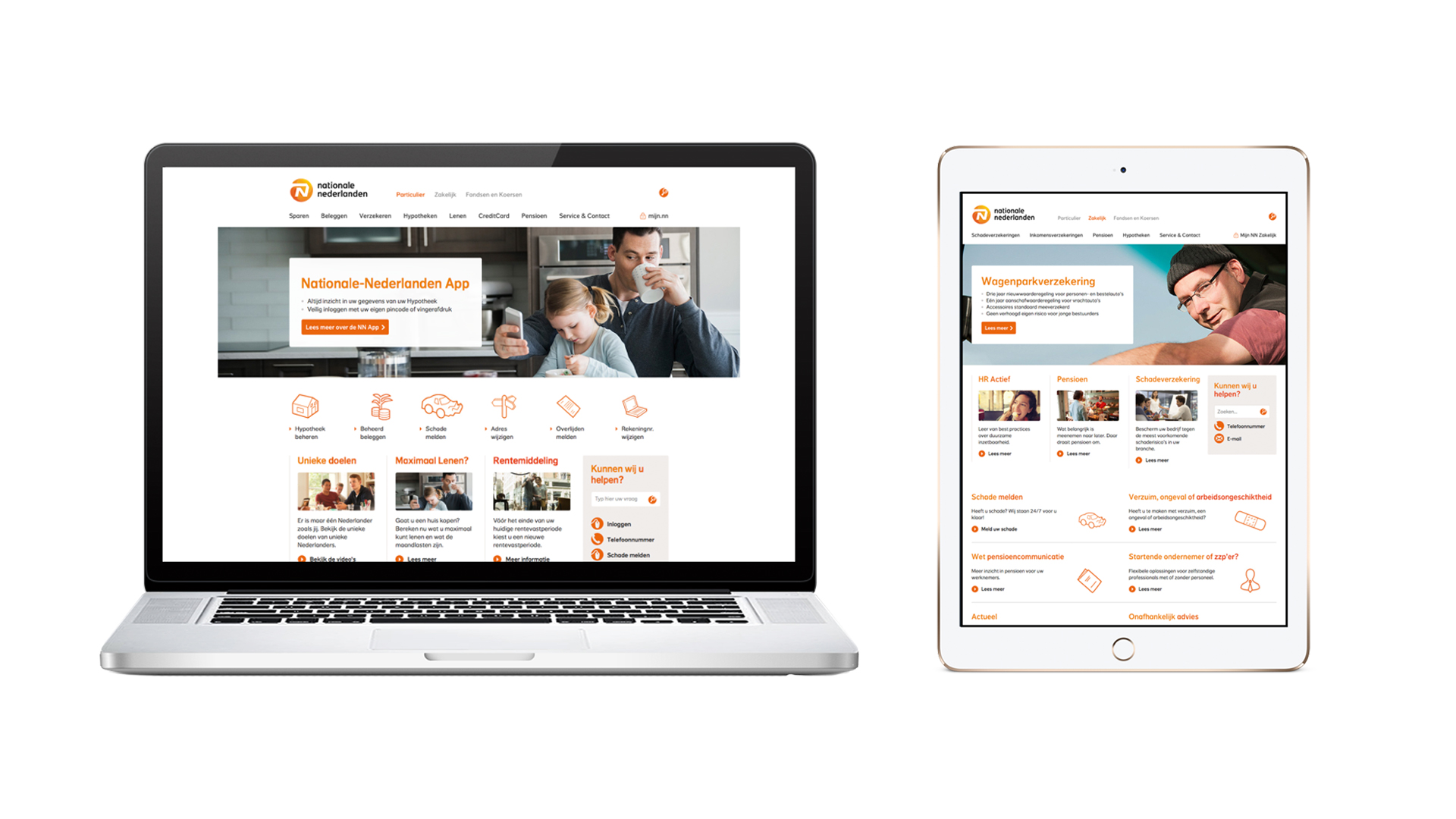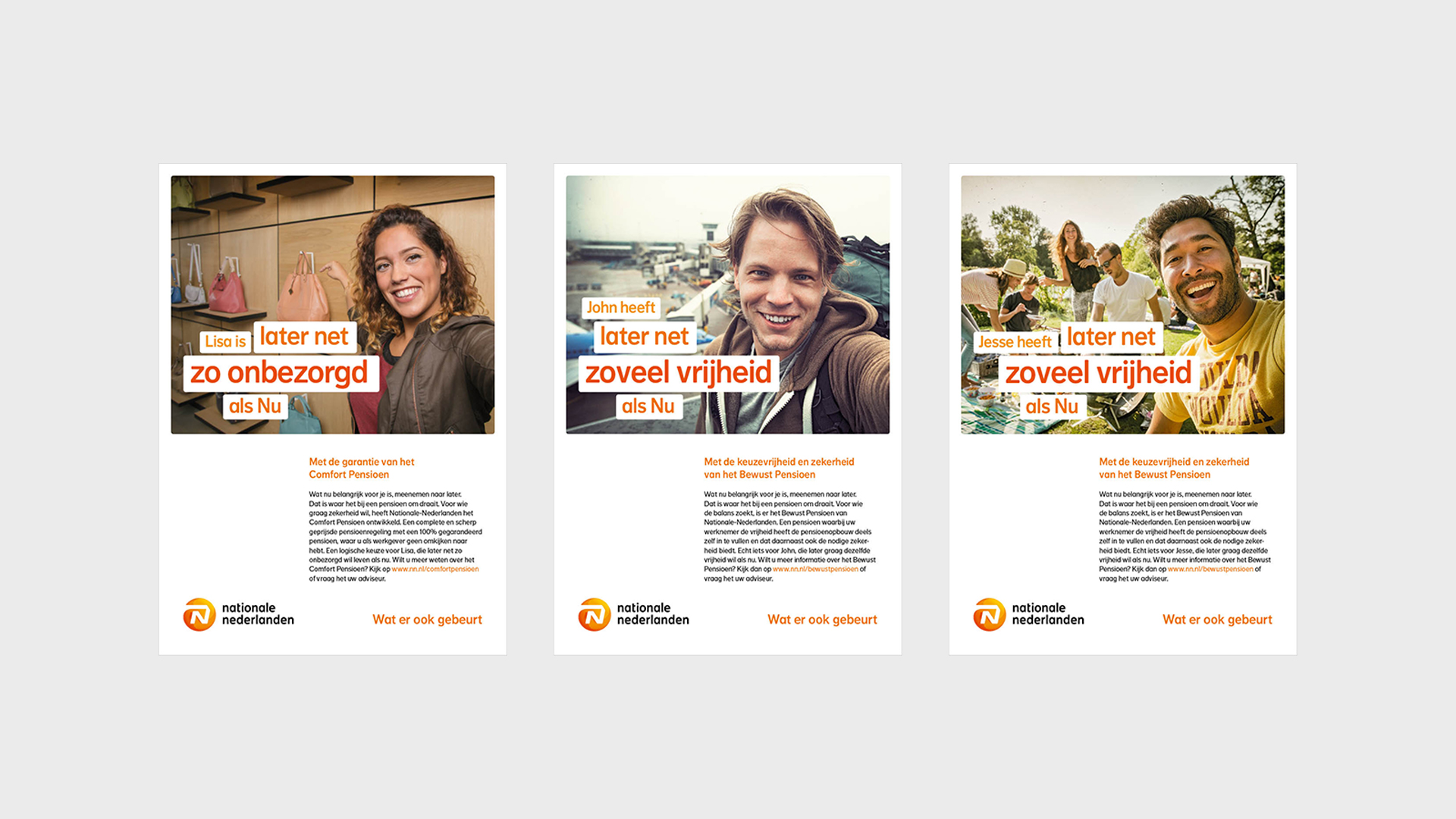 De totale visuele identiteit is aangepast. Met behoud van de kleur oranje is de stijl van fotografie, de illustratiestijl, de typografie, alles vriendelijker, helderder en toegankelijk gemaakt. Fotografen zijn meegegaan met gezinnen er is een eigen illustratiestijl ontwikkeld, een combinatie van lijntekeningen en aquarelen, waardoor het veel makkelijker wordt om een ‘verhaal’ te vertellen, en er is gekozen voor één typografie de Dagny, een heldere letter, zonder fratsen, oorspronkelijk ontwikkeld voor een Zweedse krant. Het logo is aangepast, iconischer en vriendelijker gemaakt, en de kleur oranje wordt genuanceerder toegepast, waardoor het merk niet alleen vriendelijker is geworden, maar ook veel herkenbaarder. De nieuwe stijl brak duidelijk met de wat kille en onpersoonlijk stijl van daarvoor. Nationale Nederlanden was van haar voetstuk afgekomen en weer de verzekeringsmaatschappij van Nederland voor de Nederlanders. Bij de introductie van de nieuwe merkidentiteit verving Het Financieel Dagblad de naam in het logo door ‘nieuwe nederigheid’.