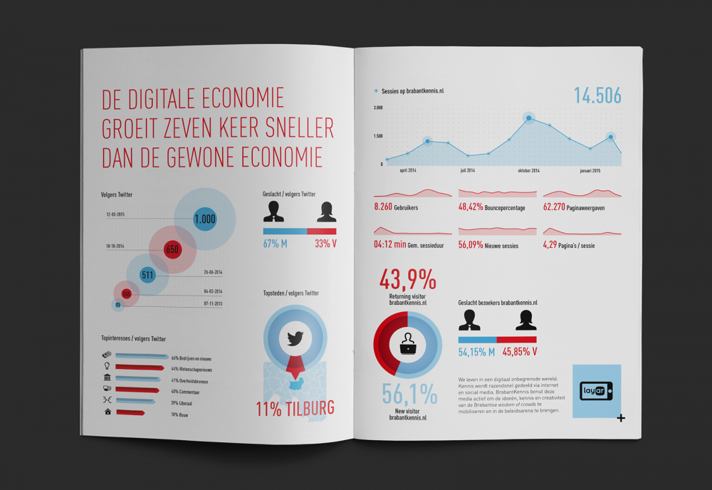 Infographics en multimediale toepassingen zorgen voor de interactie met Brabantse burgers, bedrijven en instellingen. Wervingscampagnes, informatieve publicaties en (het aanjagen van) netwerkevents zijn een tweede stap om kennis te circuleren.